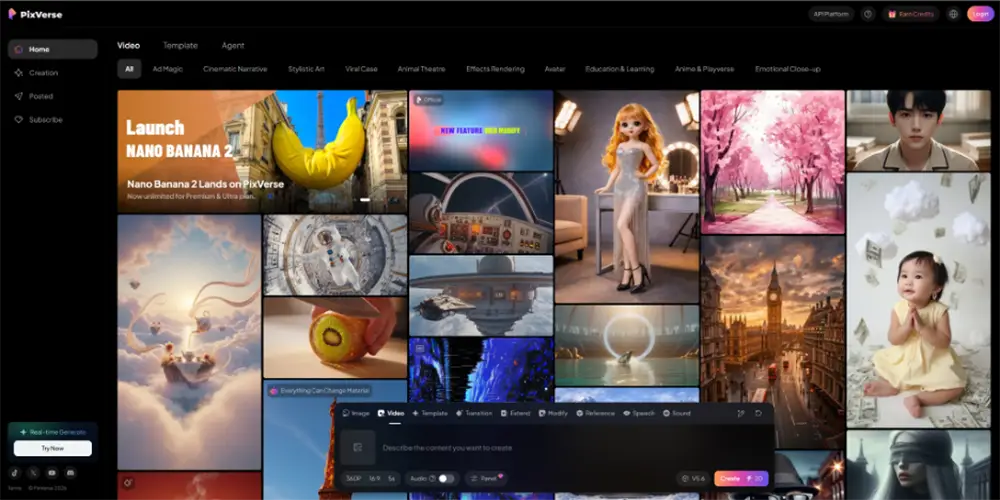 Pixverse AI is another standout platform that balances creative flexibility with high-quality outputs. At its core, Pixverse turns text prompts and static images into cinematic video clips, complete with smooth motion, realistic transitions, and support for multiple resolutions.