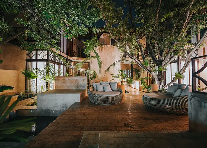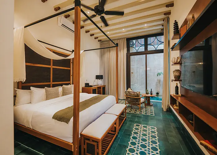 From the moment guests step through the original restored doorway, the pace shifts. A shaded vestibule opens into a sequence of cool corridors, courtyards, and softly lit interiors, echoing the traditional Yucatecan approach to climate-conscious living. High ceilings, cross-ventilation, and the interplay between indoor and outdoor spaces reflect a deep respect for local architectural traditions while setting a serene tone that feels worlds away from the bustle of the city—despite being just steps from cultural landmarks like the Railway Museum, the Museum of Yucatecan Song, and Parque La Plancha.