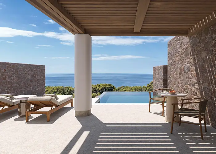 Eréma comprises 41 all-suite accommodations, each featuring a private pool and uninterrupted panoramic views of the Aegean Sea. The suites are arranged across four categories, all designed to support generous indoor-outdoor living.