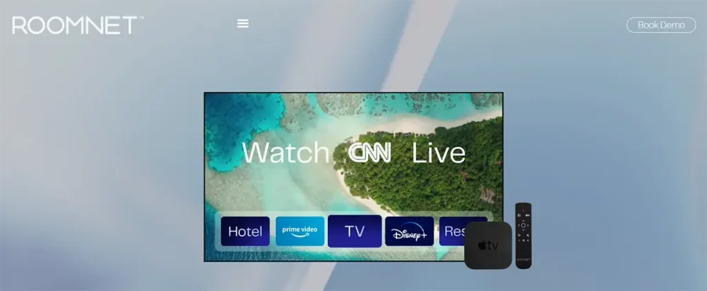 RoomNet takes a broader approach, offering not just casting but a full suite of entertainment options. It combines Apple TV-based casting with property promotions, live channels, and on-demand streaming in one polished platform.