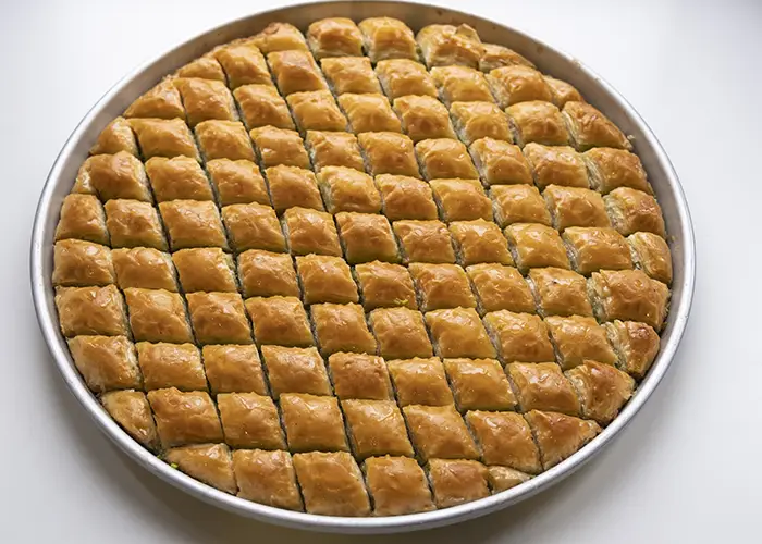 Gaziantep baklava is the first Turkish product to be granted protected status by the European Union (EU). What makes Gaziantep baklava special is not only the expert method used to craft thin layers of dough but also exceptional ingredients, including high-quality Antep pistachios and locally produced butter. Baklava masters in the city stretch dough manually until it becomes almost transparent and then generous amounts of crushed pistachios and butter are added between the delicate layers. It is baked carefully in wood-fired ovens, giving it a signature yellow colour. When all this process is completed, a syrup is poured over the freshly baked baklava, allowing it to soak in slowly. The result is the perfect Gaziantep baklava, which is crispy on the outside, soft inside, and sweet yet never heavy.