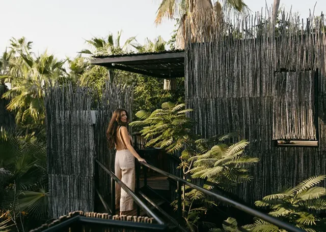 Perched within the jungle canopy, these treehouses deliver a refined yet relaxed take on barefoot luxury. Each one is designed for privacy and immersion in nature, featuring king-sized beds, open-air showers, ensuite bathrooms, and private terraces that look out over the surrounding greenery. The aesthetic is effortlessly chic—natural textures, clean lines, and soft, earthy tones that reflect the Baja landscape.
