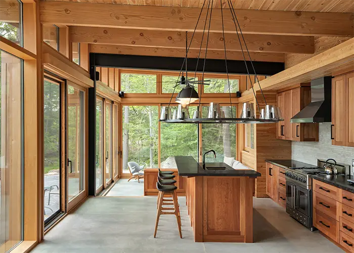 Inside, the cottage is designed to maximize views of the lake. Floor-to-ceiling windows flood the interior with natural light while framing the peaceful Muskoka scenery. The open-concept layout creates an effortless flow between the kitchen, living spaces, and the outdoors, while a central fireplace anchors the home with warmth and comfort.