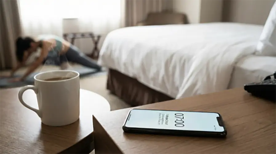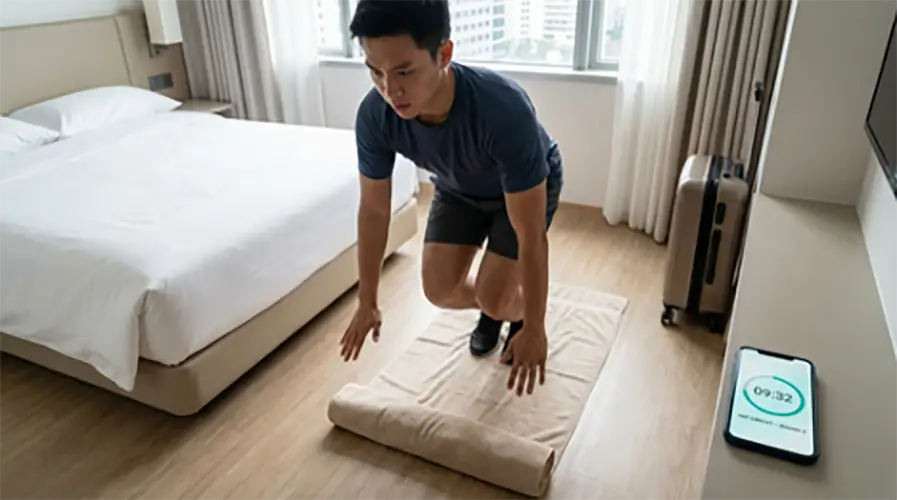 3. Turn travel friction into cues. Flight delayed? Walk to the terminal instead of sitting. Long video call? Stand and quad-stretch between slides.