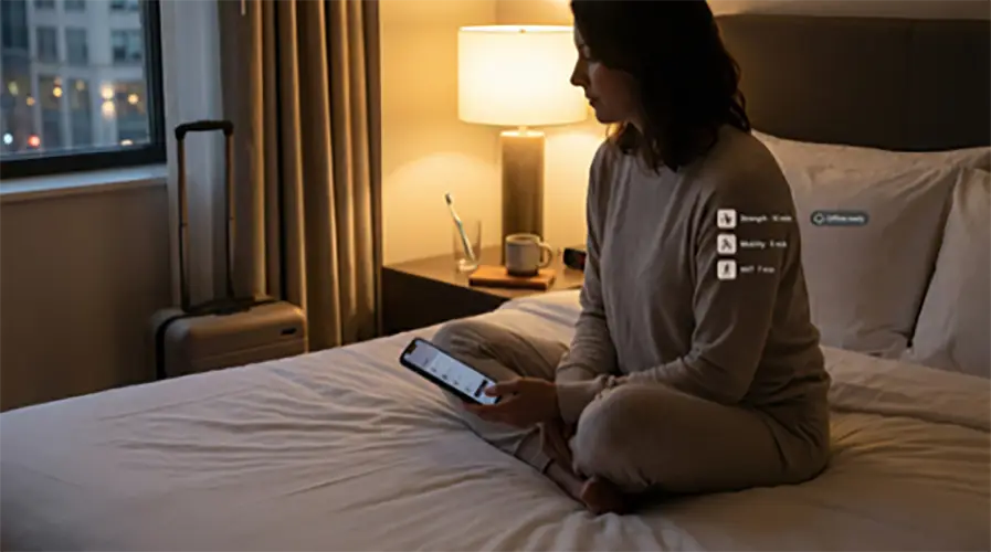 WallPilatesYes5 minFree (premium optional)Wall-supported sequences turn any hotel wall into a reformer