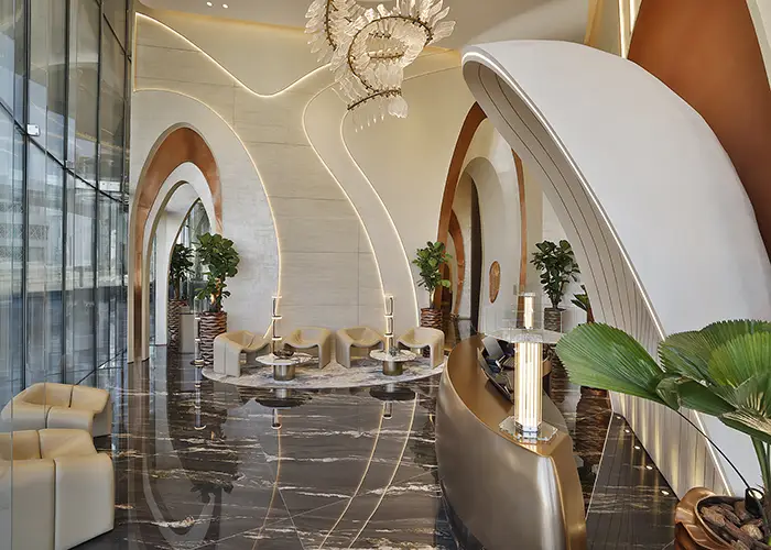 Rising 82 storeys and reaching an impressive 377 metres, Ciel Dubai Marina features 1,004 rooms and suites designed to deliver a deeply immersive, multi-sensory stay. The hotel is conceived as a celebration of contrasts—where east meets west, city blends seamlessly with sea, and dramatic scale is balanced by intimate moments. From its sky-high infinity pool to its diverse dining venues, every element has been carefully curated to evoke emotion, tell a story, and leave a lasting impression. Interiors flow with a natural rhythm, pairing soft curves and tranquil palettes with energising lighting, warm tones, and tactile organic materials. The result is a refined environment that feels both luxurious and grounded, offering guests a sense of calm connection alongside unmistakable drama.
