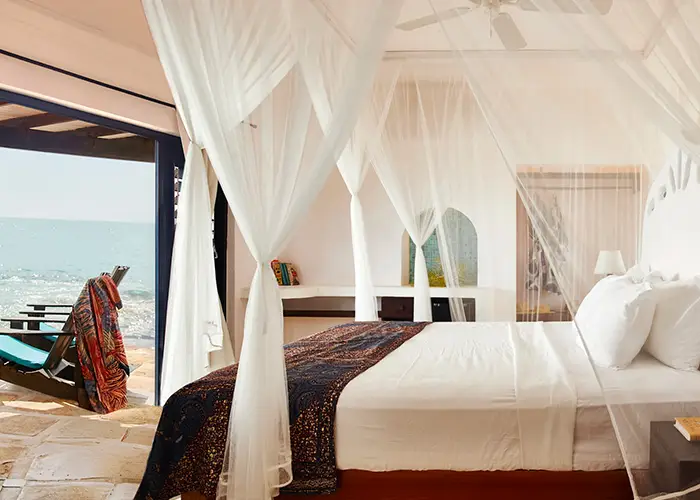 No two spaces are alike. Handmade headboards are inlaid with fragments of stained glass, casting jewel-toned light across sculpted plaster walls. Batik and African-print textiles bring warmth and depth, layered against crisp white linens and airy mosquito netting.