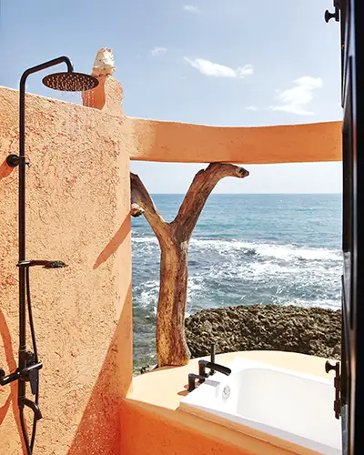 Each bungalow features an open-air shower set within colorful stucco walls, opening directly toward the sea. Rainfall showerheads, ocean views, and thoughtful details—like conch shells embedded in plaster—turn a simple rinse into something almost ritualistic.