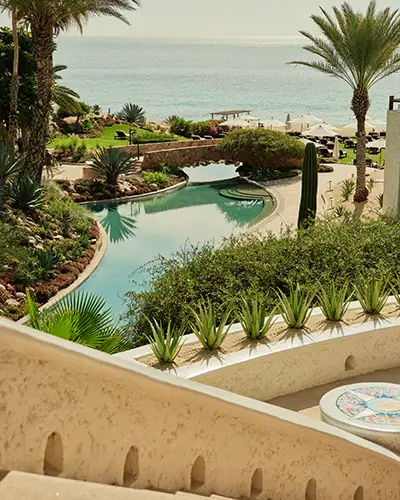 Las Ventanas is more than just built; it is carefully crafted. Whitewashed walls, hand-laid stone, and winding pools show a blend of Mediterranean style and Mexican artistry. Every detail, from limestone floors to hand-carved furniture, honors local craftsmanship.