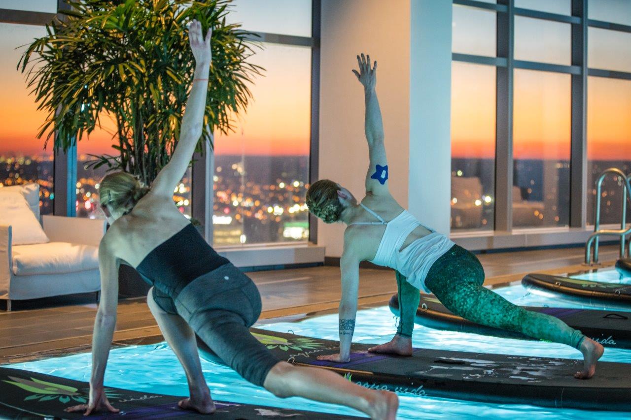 AKA University City, Philadelphia’s luxe new skyscraper hotel, offers guests complimentary “yoga on the water” as the sun sets over the Philadelphia skyline in the 72-foot infinity pool.