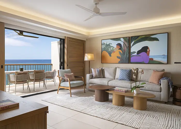 The redesign spans both the Main Tower and Beachfront Wing, honoring the resort’s iconic midcentury modern roots while introducing a renewed sense of warmth and understated luxury. Original terrazzo flooring in the Beachfront Wing, the signature blue tile floors of the Main Lobby, and the Main Tower’s expansive lanais have been carefully preserved. New design elements—including rich wood finishes, handcrafted textiles inspired by Hawaiian weaving and quilting, plantation shutters, ceiling fans, expansive glass lanai doors, intuitive bedside lighting controls, and spa-like bathrooms with deep soaking tubs—create a refined yet relaxed atmosphere. Works by local artists and layered textures throughout the resort deepen the connection to place.