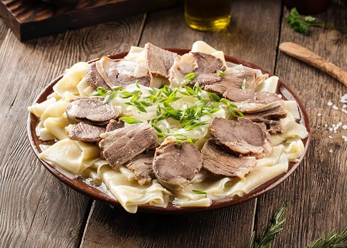 Of course, first of all we tried beshparmak – the most popular national Kazakh dish, a must-try. Beshbarmak is made from lamb or beef. The meat is simmered with aromatic spices, then the noodles are cooked separately in the same broth, along with the onions. Interestingly, in Kazakh culture it is used to eat beshparmak and some other dishes with hands. We also tried manty, fresh flatbreads, and local tea – everything simple, yet surprisingly filling and authentic.