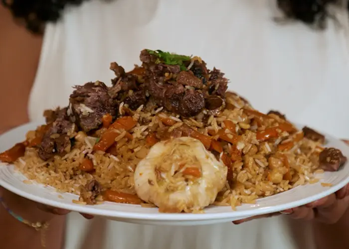 We tried the local varieties of pilaf. Interestingly, although it shares the same name as Central Asian pilaf, the taste is completely different. In Uzbekistan, the dish is cooked in a same pot: rice, meat, carrots, and spices simmer together, infusing juices and flavors, resulting in a hearty, rich dish. In Azerbaijan, however, the rice and filling such as meat or dried fruits are cooked separately in different pots and mixed when serving.
