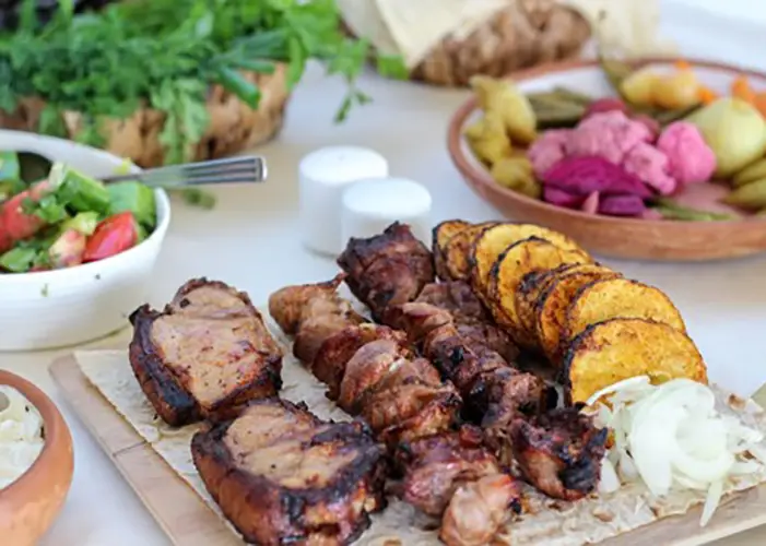 In Armenia I was strongly encouraged to try local barbeque – khorovats. It is made from pork or lamb with special marinade. It quickly became my favorite barbecue I’ve ever had. And I liked that it is served in Armenian lavash accompanied by grilled potatoes and vegetables. I also tried local fermented soup spas and sweet gata.