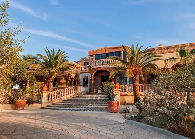 The collection of works displayed in the house includes pieces by American painter and muralist Thomas Hart Benton. It also carries echoes of the past, from a long carved table once belonging to Mark Twain to balustrades, cabinets, and moldings salvaged from the renovation of the historic Jack Warner Estate in Beverly Hills. Every corner bears a trace of the family’s imagination: a tiled creature hidden within the grand fountain, sculptural motifs that encircle the property, and statues that greet visitors at the entrance. The cliffside pool features a hand-tiled marlin so vivid that seabirds have been seen diving toward it, mistaking it for real prey. Inside, angels play across the living room ceiling, one mischievously peeling back painted curtains from the only window without drapery. Even the ivy winding along the walls, painted decades ago, continues to grow brushstroke by brushstroke, a living testament to creativity passed down through generations.