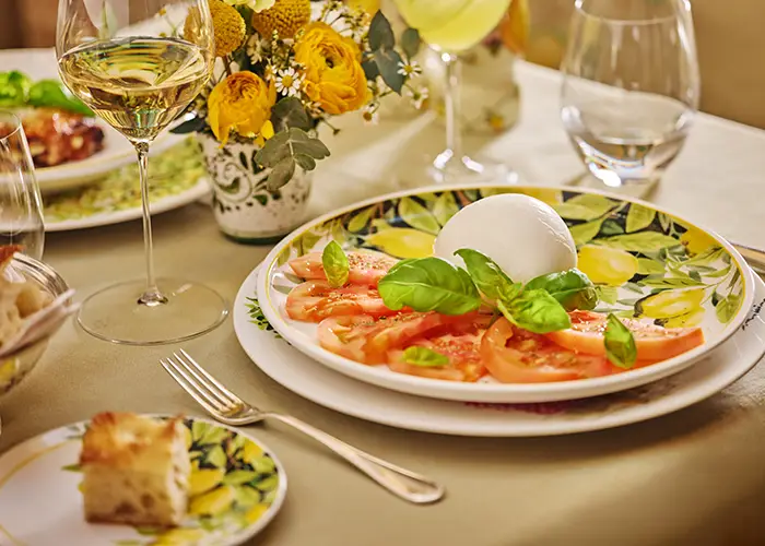 The artistic ceramics featured in the mise en place at La Minerva Bar are the result of a shared vision between Lino di Paolino and renowned Capri-based artist and ceramist Sergio Rubino, evoking nature and the joyful Mediterranean aesthetic.