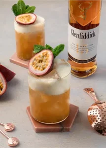 Bring tropical vibes to your spring sipping with Glenfiddich’s Golden Hour cocktail. A tasteful blend of the rich, smooth character of Glenfiddich 15 Year Old with passion fruit, lime, and a touch of vanilla syrup. The frothy egg white and fresh mint garnish make this cocktail as beautiful as it is delicious.
