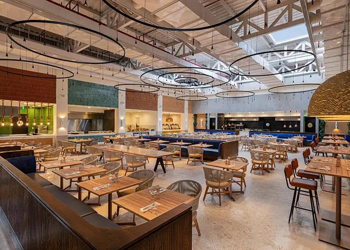 A lively, cosmopolitan food hall inspired by global street markets. Multiple live-action counters, bold graphic design, and Dominican ingredients meet international flavors in a space that shifts seamlessly from breakfast through late night.